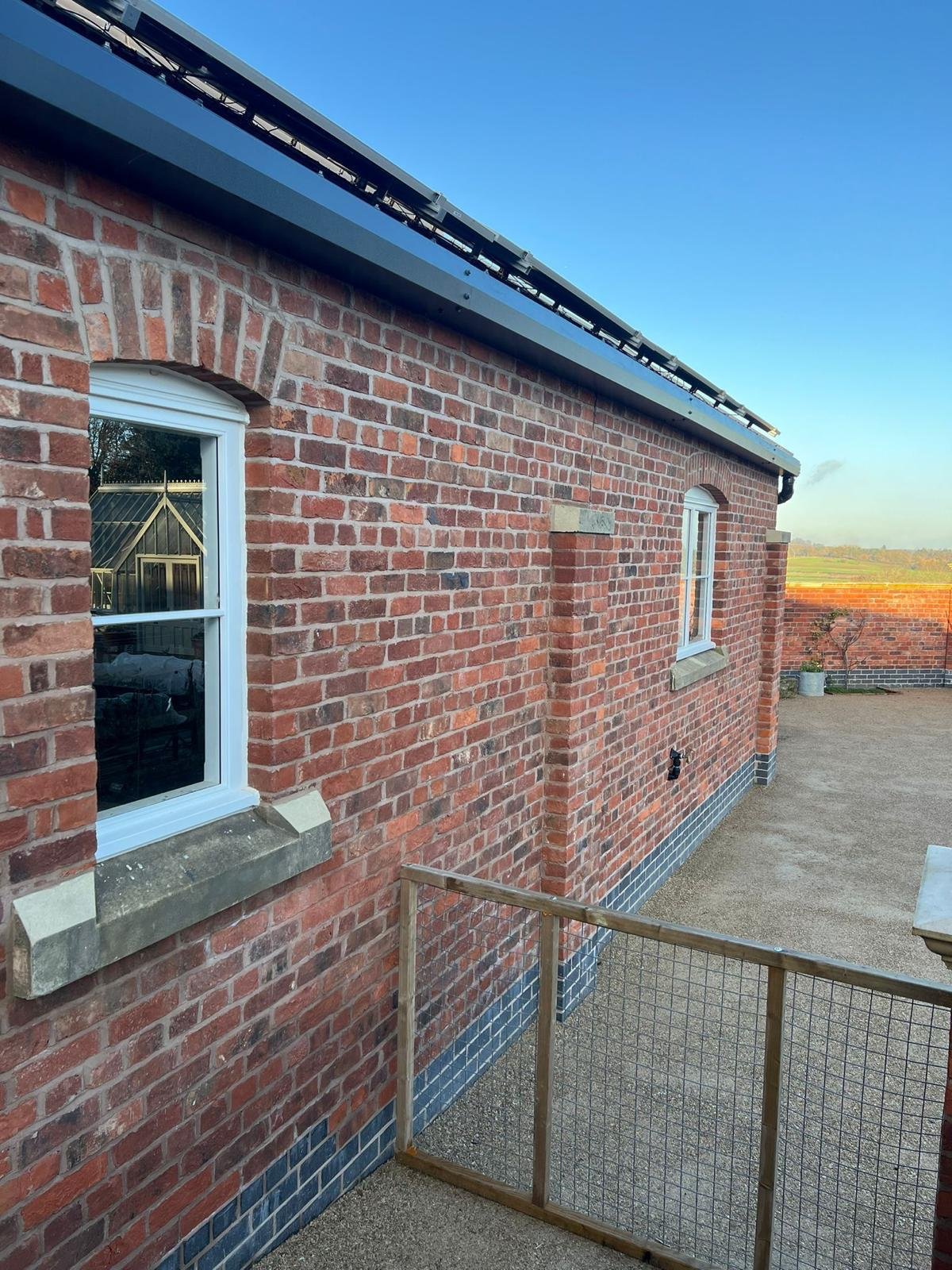 The client required large, robust doors in which Derwen Joinery manufactured two impressive double barn doors, each standing 3.6m tall and made from durable Sapele hardwood. These doors featured an arched top rail to complement the brick arch above, with glazing to allow natural light into the space. The doors were hung on pins set directly into the brickwork and a custom top hinge was fabricated to follow the curvature of the arch, ensuring strength without compromising on visual appeal.